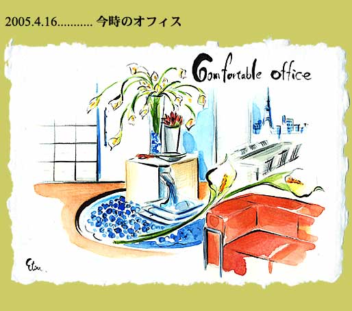 今週はイベントとオフィスのデコレーションの仕事が続いた。 新しい今時のオフィスだ。東京タワーも富士山も眺められるパノラマビューの大きな窓、スモークガラスで仕切られたミーティングルームにはイタリア物の特注ファニチャーが並び白いシンプルなデスクの上にはパソコンだけで、山積みになった書類が……という光景は無い。 そんなシャープな空間の中に水の流れる音が心地良い。 そこに花を加える空間演出のお手伝いをするのが今回の仕事。 背丈ほどのスケールでカラーの花をデコレーション。 気持ちのよい空間で仕事をするのってやっぱり気持ちいいだろうな〜と、羨ましく思いながら……。 とりあえず私のこの机の上、何とかせねば……空間がB4サイズしかない! ラフスケッチが、資料の雑誌が、雪崩れる〜!!!
