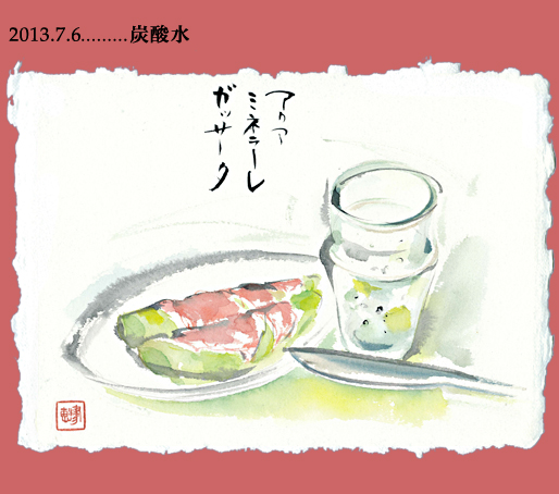 蒸し暑いね〜。こんな何にもやる気のない日はAcqua minerale gassata と買い置きのメロンの上に生ハム乗っけて、もうそれだけ。「もう少しちゃんとした料理らしいもの作れば〜」とか何とか言われても。ううん!もうこれが一番。シュワ〜っとした、炭酸水と完熟メロンの上に、ちょっとケチなくらいの量の生ハム、ナイフで切って突き刺して、ああ。手抜きディナー。良いじゃん大好物なんだからさ。明日は何か作るからさ。許してケロ!
