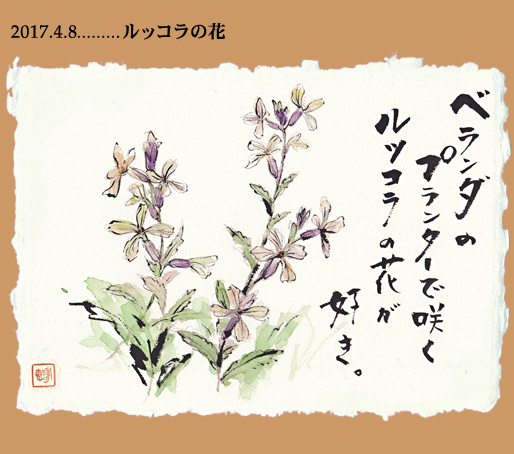 葉っぱを少しちぎってはサラダに加えていたんだけど、この花が好きで咲かせたくて、残しておいたルッコラの花が満開だ。満開の話題なら桜でしょう?と言われそうだけど、ご存じ無い方も多いだろうと描いてみた。