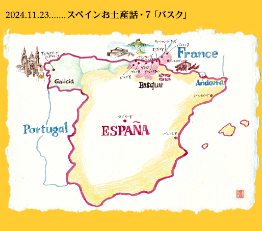 絵は右のバスクの旗が立っているのはBILBAO名物の「カロリーナ」という甘酸っぱいメレンゲクリームのかわいいお菓子。サンタさんみたいなおじさんが嬉しそうにつぶさないように、恐る恐る持ち運ぶ姿が可愛すぎて「私もあれ食べる〜!」。右下の「メンブリージョ」とはチーズのお供で西洋かりんのジャムみたいなもの。最初はわからず、私たちは「イチジク羊羹」と呼んでいた。チーズと一緒に食べるようだ。知らないスイーツがまだまだあるもんだ!